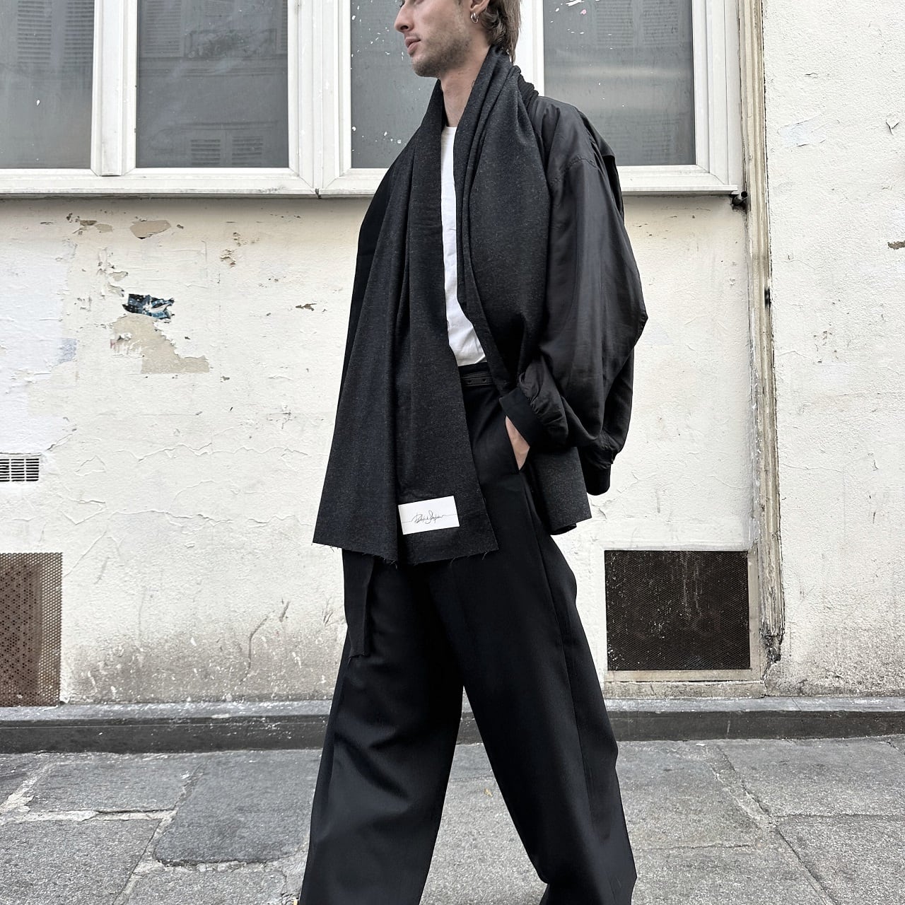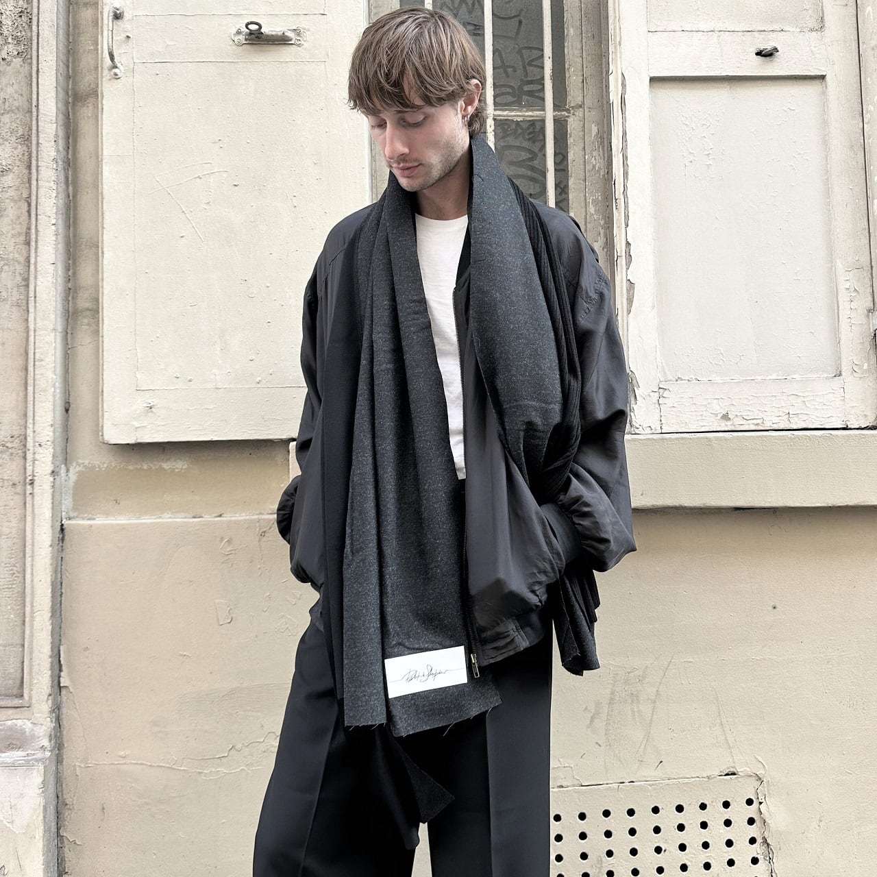4種の異なる素材を用いた幅広ロングストール。グレースケールの濃淡がコーディネートに立体感を与えてくれます。