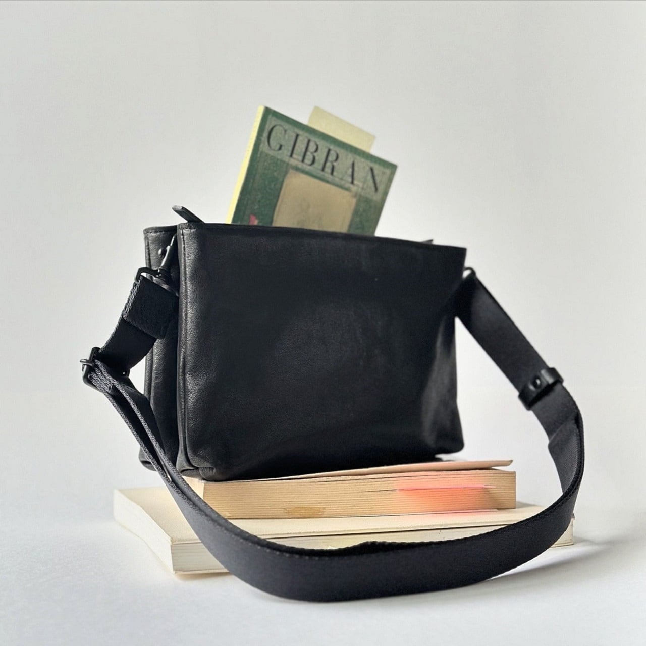 ファスナー付きのふたつのバッグがつながった’ツインポシェット’です。中央にもものが入れられるので、合計3つの収納箇所があります。